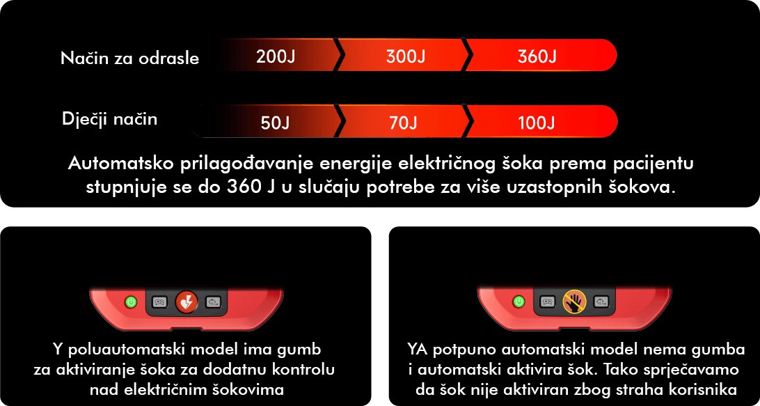 Serija HeartSave Y | YA omogućuje brzu analizu i spremnost za isporuku šoka – samo 5 sekundi od analize do spremnosti za šok i otprilike 14 sekundi od pokretanja uređaja do šoka pri 200 J.
